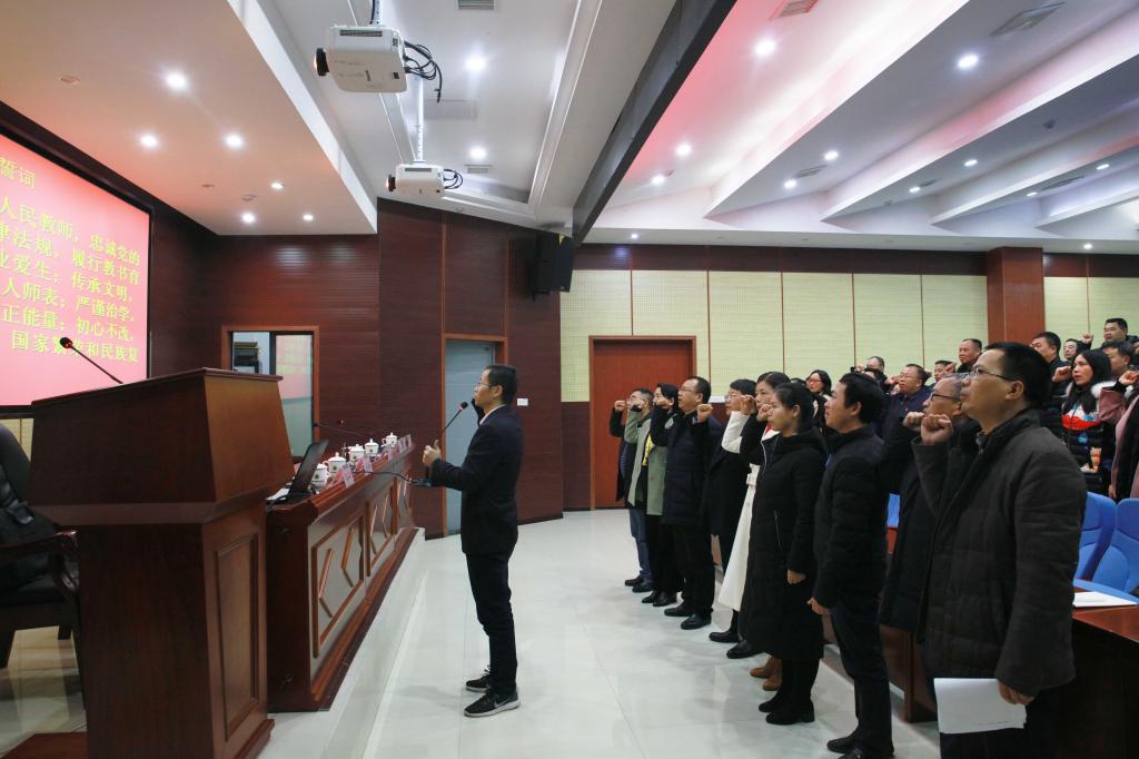 全国优秀教师、马克思主义公司匡烈辉老师率领全体参会人员举起右手庄严宣誓,立志做一名忠诚党的教育事业、遵守教育法律法规、履行教书育人职责的合格人民教师。