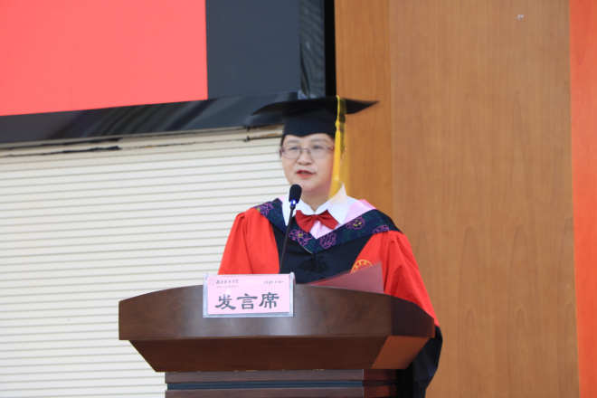 毕业生代表姜颖同学发言,衷心祝愿毕业学子们能将大学所得化为前进的力量,在工作中承担起青年人的使命与担当,并且铭记品学兼修、知行统一的校训。