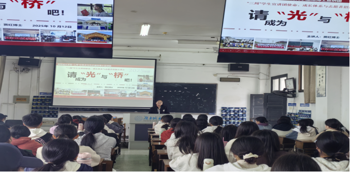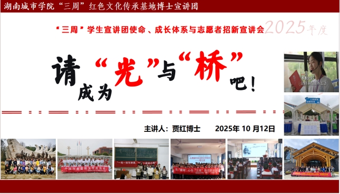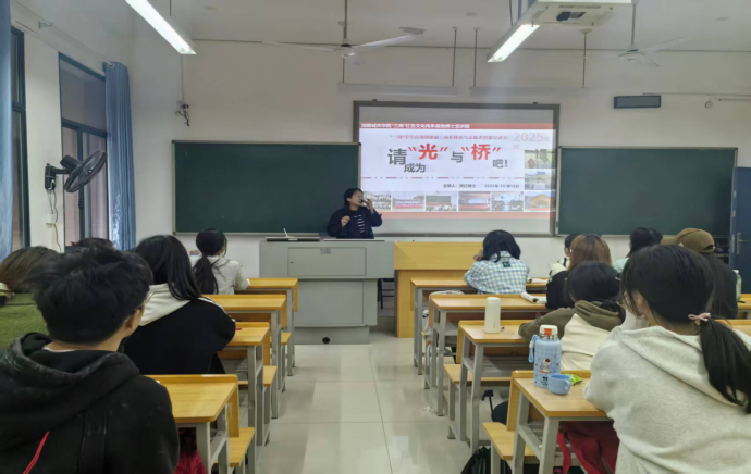 2025年10月12日,“三周”红色文化传承基地执行主任贾红博士以《请成为“光”与“桥”吧:红色文化传承中的我们》为题,向2025级新生开展主题宣讲,系统阐释基地员工宣讲团的使命愿景、成长体系与2026年度招新计划。